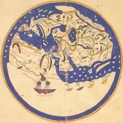 Planisphère d'Al-Idrîssî Carte circulaire d'un géographe marocain pour Roger II de Sicile, figurant le monde Le sud est en haut de la carte. Copie du Caire datant de1456, l'original de Palerme (Sicile) de 1154 gravé sur une plaque en argent de 200 kg ne nous est pas parvenu… Crédit : Oxford, The Bodleian Library